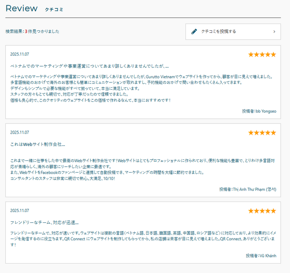 将发布在Google商家资料上的顾客评论,自动导入至ぐるっと東京的贵店页面。此外,以外语撰写的评论会自动翻译成日语,而日语评论则会翻译成英语、中文、韩语等多语言后发布。