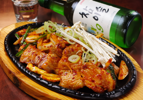 我们也备有多种韩国酒类,如带有水果风味的 Chamisul 和马格利酒。欢迎搭配菜肴一同享用。